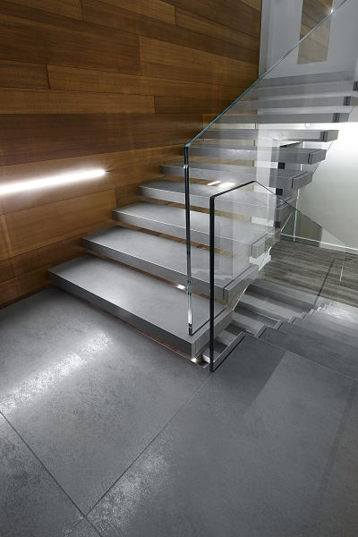 la scala a sbalzo con i gradini rivestiti in gres porcellanato e i parapetti in vetro.