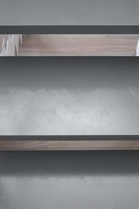 Come supporto alla definizione della scala interna abbiamo realizzato per il cliente una campionatura della finitura della resina dei gradini e della verniciatura dell’acciaio.